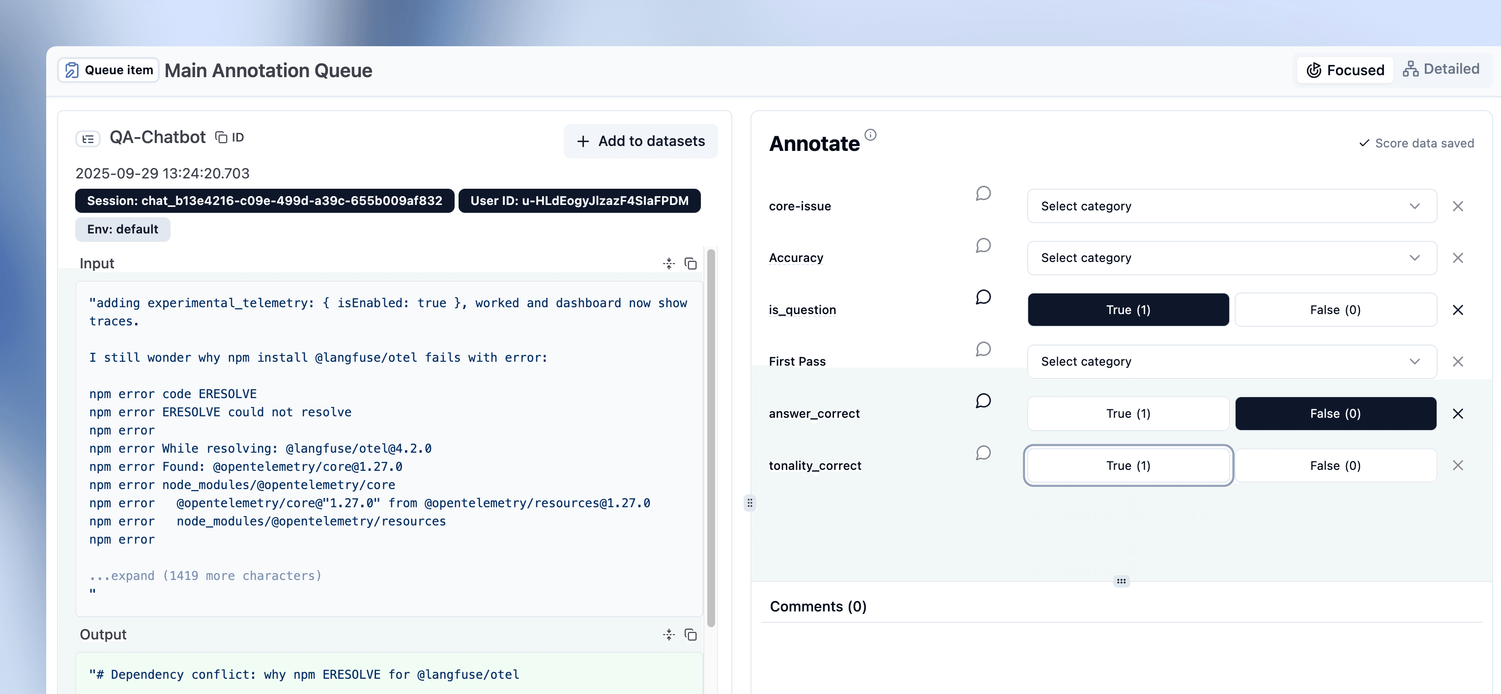 Langfuse observability trace detail view showing nested observations with latency and cost
